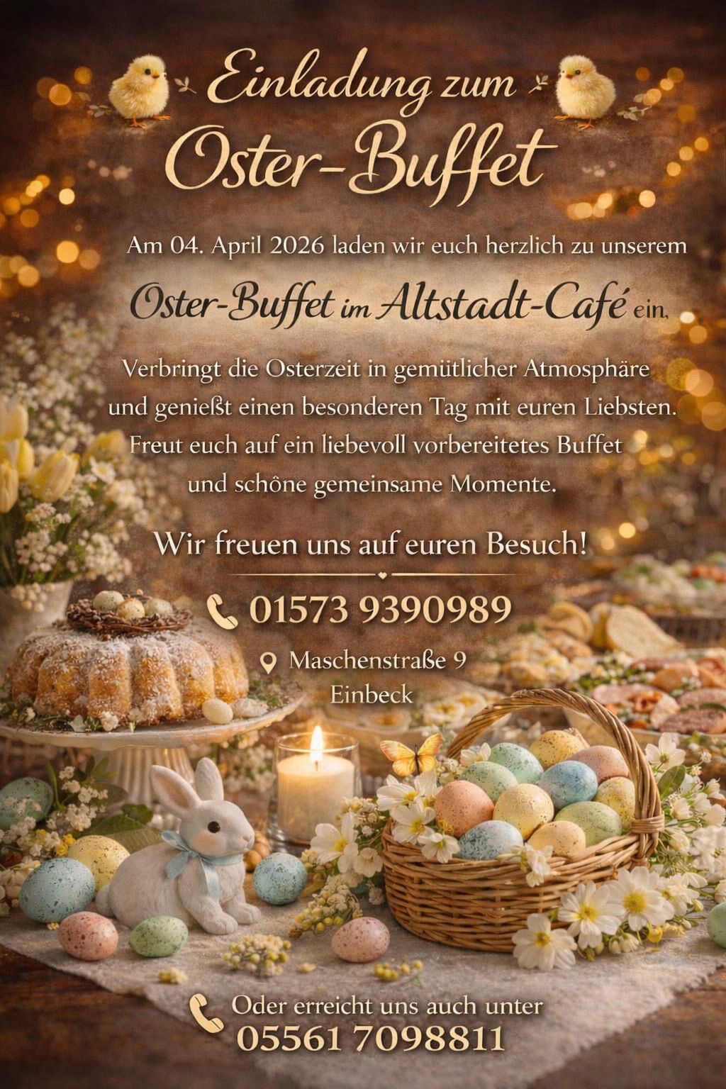 Unser umfangreiches Frühstücksangebot mit über 20 Frühstückvariationen bietet alles, was Sie für einen guten Start in den Tag benötigen. Ob Bauern-, Sekt- oder ein Festtagsfrühstück - hier bleiben keine Wünsche offen. Neben Mittagssnacks für den kleinen Hunger und einer großen Auswahl an Kaffee- und Teespezialitäten verwöhnen wir unsere Gäste mit einem wechselnden Kuchen- und Tortenangebot, das täglich frisch zubereitet wird. Wir laden Sie ein, bei einem Besuch in unserem Altstadt-Café entspannte Stunden zu verbringen und freuen uns auf Sie.